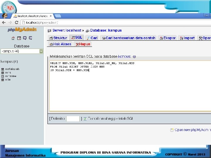 SELECT MHS. NIM, MHS. NAMA, Nilai. KD_MK, Nilai. MID FROM Nilai RIGHT OUTER JOIN MHS ON Nilai. NIM = MHS. NIM Hasil : NIM NAMA KD_MK 10296832 10296126 31296500 41296525 21196353 50095487 10296001 21198002 Nurhayati Astuti Budi Prananigrum Quraish Pipit Fintri Julizar KK 021 KD 132 KK 021 KU 122 KD 132 - MID 60 70 55 90 75 80 -