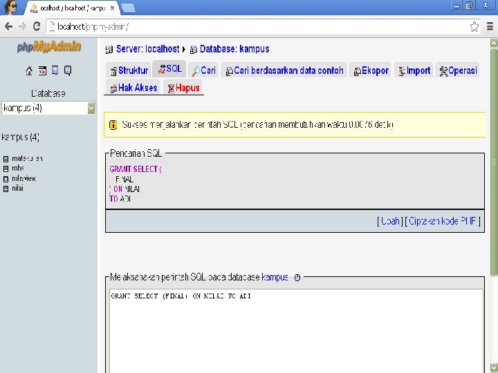 2. REVOKE Sintaks : REVOKE hak_akses ON nama_db FROM nama_pemakai ; REVOKE hak_akses ON nama_tabel FROM nama_pemakai ; Contoh : Tarik kembali dari Adi hak akses untuk menampilkan nilai final test REVOKE SELECT (FINAL) ON NILAI FROM ADI