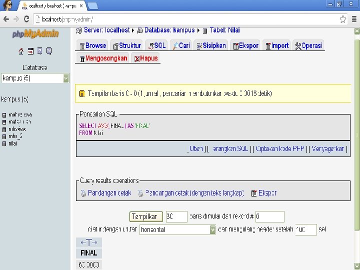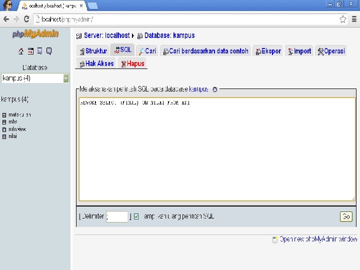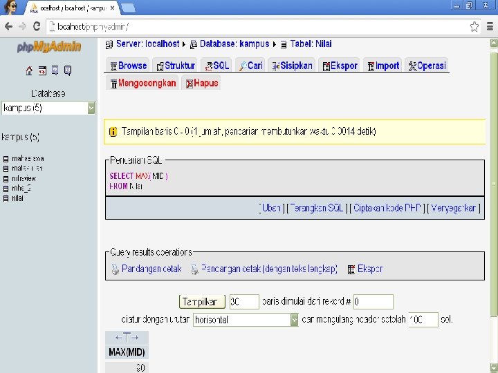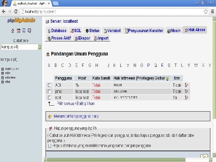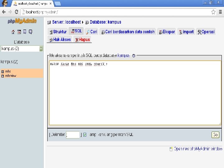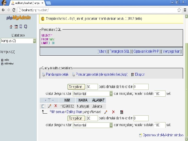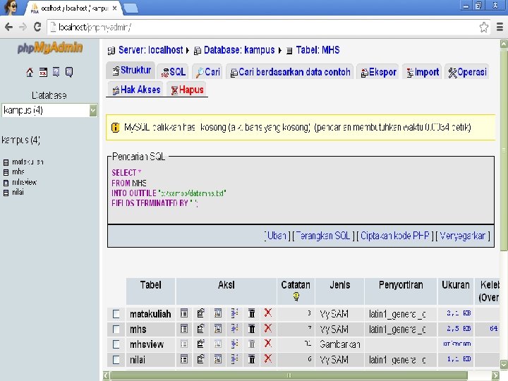 Aplikasi yang digunakan sebagai contoh adalah phptriad-mysql front Dari Address ketik : http: //localhost/phpmyadmin Tampilan password ketik root dan untuk password ketik password