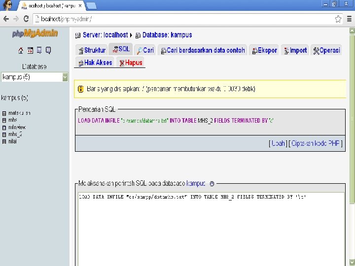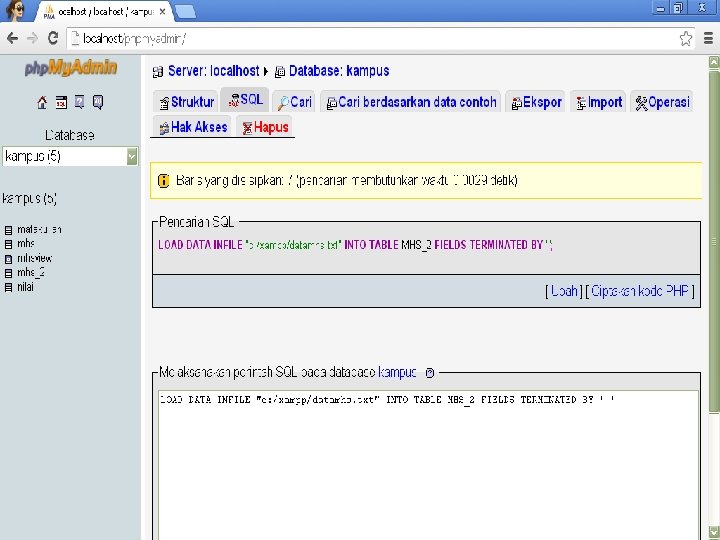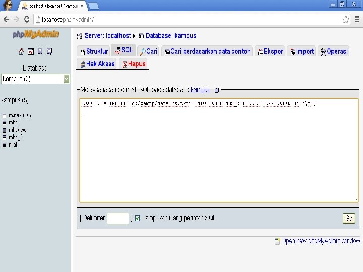• LOAD DATA INFILE "c: /xampp/datamhs. txt" INTO TABLE MHS_2 FIELDS TERMINATED BY 't';