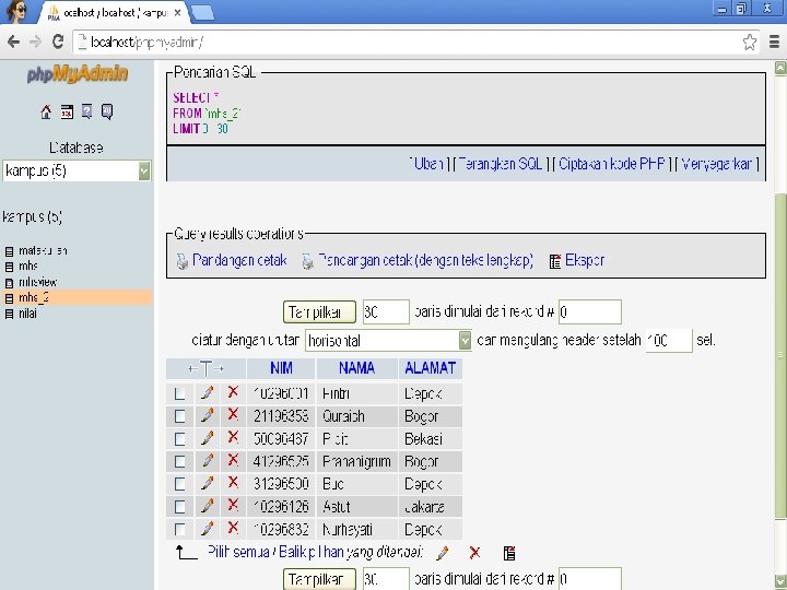 Contoh : . a. Tampilkan semua data mahasiswa SELECT NIM, NAMA, ALAMAT FROM MHS; Atau SELECT * FROM MHS; Maka hasilnya adalah : NIM NAMA ALAMAT 10296832 10296126 31296500 41296525 Nurhayati Astuti Budi Prananingrum Jakarta Depok Bogor