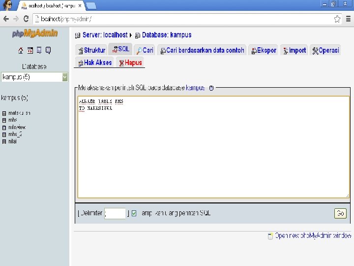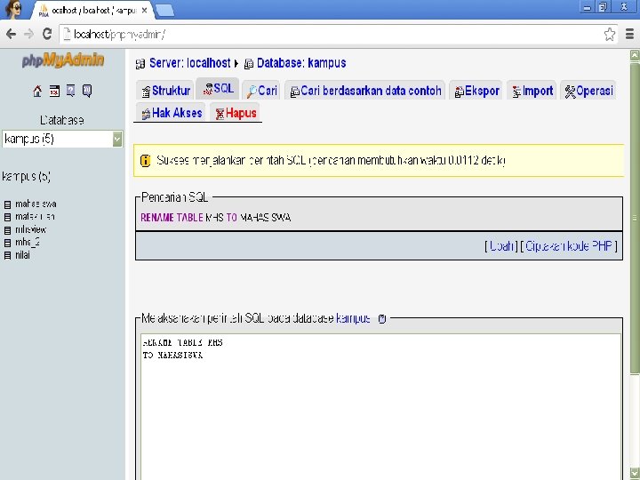 3. RENAME TABLE Sintaks : RENAME TABLE Oldnama. Tabel TO New. Nama. Tabel Contoh : RENAME TABLE MHS TO MAHASISWA