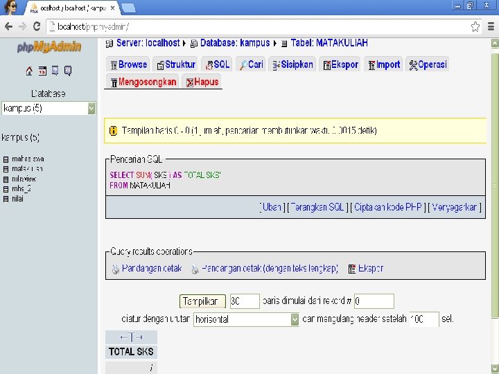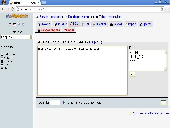 b. Tampilkan Mata Kuliah yang SKSnya 2 Select NAMA_MK from Mata. Kuliah Where sks = 2 Maka Hasilnya : NAMA_MK Sistem Basis Data Pancasila
