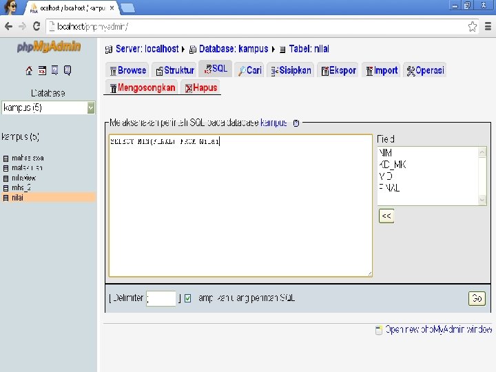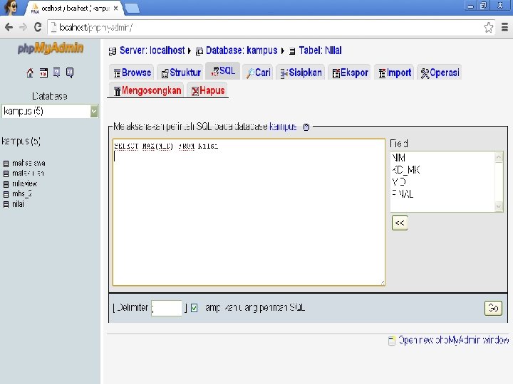 Tabel dibawah ini untuk mengerjakan Select (tampilan) dari SQL dan tambahkan dua tabel baru yaitu tabel Nilai dan Mata. Kuliah Tabel Nilai NIM 10296832 10296126 31296500 41296525 21196353 50095487 KD_MK MID FINAL 60 70 55 90 75 80 75 90 40 80 75 0 KK 021 KD 132 KK 021 KU 122 KD 132 Tabel Mata. Kuliah KD_MK KK 021 KD 132 KU 122 NAMA_MK Sistem Basis Data Sistem Informasi Manajemen Pancasila SKS 2 3 2
