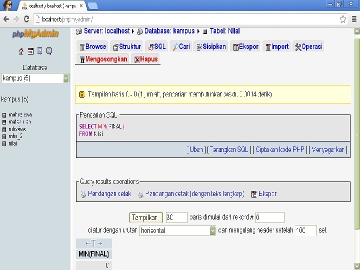 3. AVG digunakan untuk menghitung rata-rata dari data-data dalam sebuah kolom. SELECT AVG(FINAL) AS ‘FINAL’ FROM Nilai 4. MIN digunakan untuk menghitung nilai minimal dalam sebuah kolom. SELECT MIN(FINAL) FROM Nilai 5. MAX diguankan untuk menghitung nilai maksimum dalam sebuah kolom SELECT MAX(MID) FROM Nilai