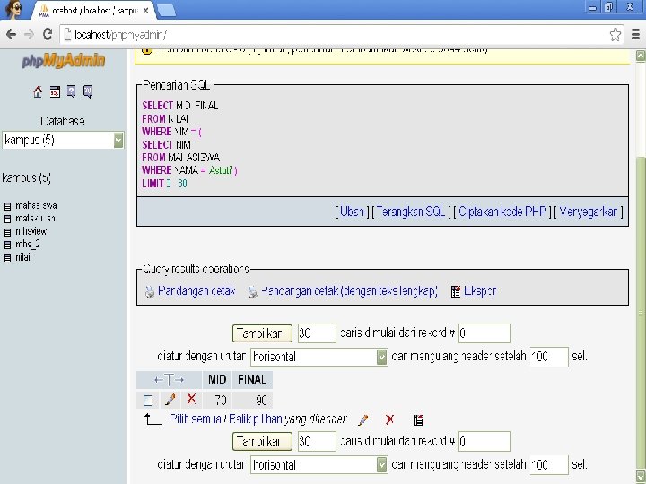 SELECT Nilai. NIM, MHS. NAMA, Nilai. KD_MK, Nilai. MID FROM Nilai INNER JOIN MHS ON Nilai. NIM = MHS. NIM Hasil : NIM NAMA KD_MK 10296832 10296126 31296500 41296525 21196353 50095487 Nurhayati Astuti Budi Prananigrum Quraish Pipit KK 021 KD 132 KK 021 KU 122 KD 132 MID 60 70 55 90 75 80