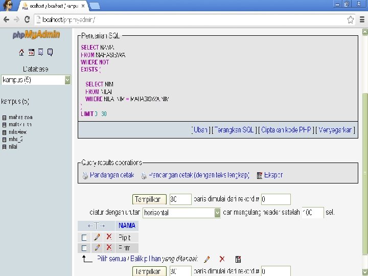 3. Ambil nama-nama mahasiswa yang mengikuti ujian. SELECT NAMA FROM MAHASISWA WHERE EXISTS (SELECT NIM FROM NILAI WHERE NILAI. NIM= MAHASISWA. NIM) 4. Ambil nama-nama mahasiswa yang tidak mengikuti ujian. SELECT NAMA FROM MAHASISWA WHERE NOT EXISTS (SELECT NIM FROM NILAI WHERE NILAI. NIM= MAHASISWA. NIM)