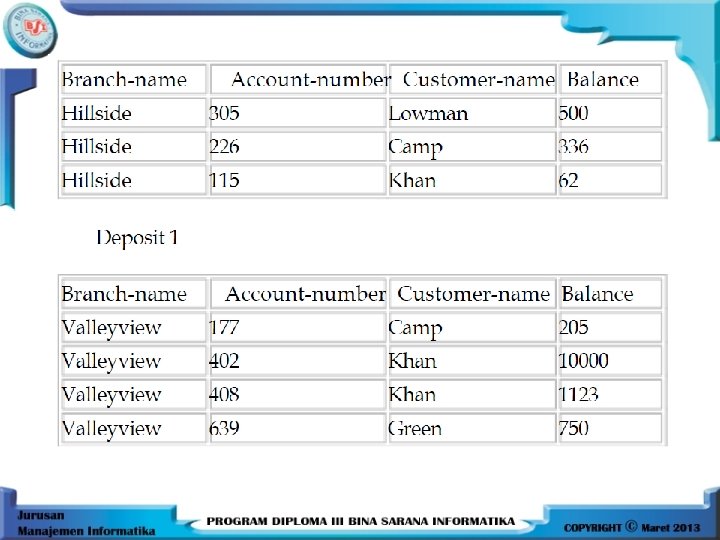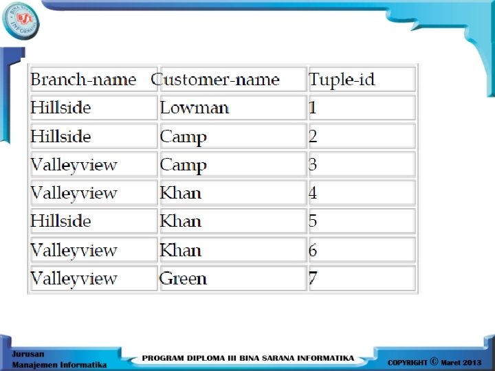 Relasi 1 = NIM, Nama_Mhs, Mt, Kuliah, Nil_Akhir, Grade, Tuple_ID NIM, Nama_Mhs, Mt, Kuliah, Nil_Akhir, Grade, Tuple_ID (UJian) NIM Nama_Mhs 123 124 125 126 127 128 129 Fathi Farah Salsabila Azizah Farhan Faiz Mt_Kuliah Sistem Basis Data Peranc. Sistem Basis Data Visual Basic Peranc. Sistem Nil_Akhir Grade Tuple_ID 78 60 40 90 70 40 80 B C D A B D A 1 2 3 4 5 6 7
