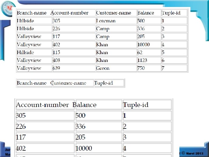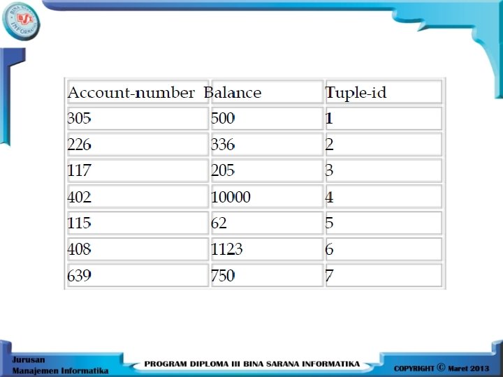 Relasi 2 = NIM, Kode_MK, Nil_Akhir, Grade, Tuple_ID (Ujian) NIM Kode_MK 123 124 125 126 127 128 129 101 102 101 103 102 Nil_Akhir Grade Tuple_ID 78 60 40 90 70 40 80 B C D A B D A 1 2 3 4 5 6 7
