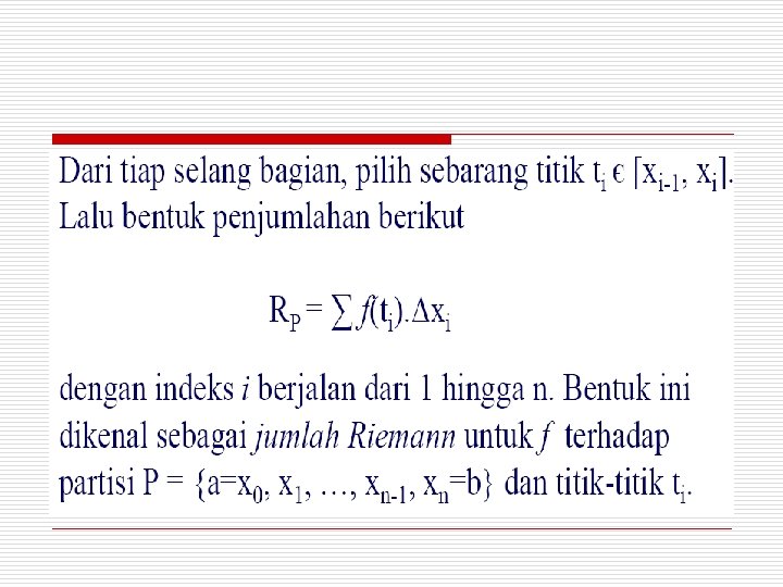 Latihan o o Ambil beberapa fungsi sederhana yaitu fungsi linier atau kuadrat, dengan batas yang ditentukan Tentukan Luas Daerah dengan partisi dan menggunakan limit Jumlah Riemann Agak sedikit loncat. . selesaikan fungsi dan batas tertentu tadi dengan integral tentu dan bandingkan dengan hasil limit jumlah Riemann Presentasikan setiap kelompok…Apa yang dapat ditealaah