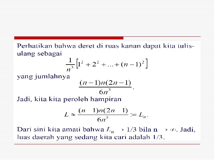 Perenungan Selanjutnya dapat direnungkan bahwa pendefinisian integral tentu dalam mencari luas daerah adalah sama dengan mencari limit jumlah Riemannya