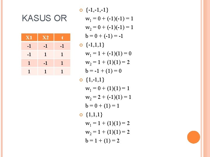 KASUS OR X 1 X 2 t -1 -1 1 1 {-1, -1} y = 0 + (0. -1 + 0. -1) = 0 y ≠ t, maka update bobot dan bias W 1 baru = 0 + 1. -1 = 1 W 2 baru = 0 + 1. -1 = 1 bias baru = 0 + 1. -1 = -1 {-1, -1} y = -1 + (1. -1 + 1. -1) = -3, output = -1 {-1, 1, 1} y = -1 + (1. -1 + 1. 1) = -1 y ≠ t, maka update bobot dan bias W 1 baru = 1 + 1. 1. -1 = 0 W 2 baru = 1 + 1. 1. 1 = 2 bias baru = -1+ 1. 1 = 0