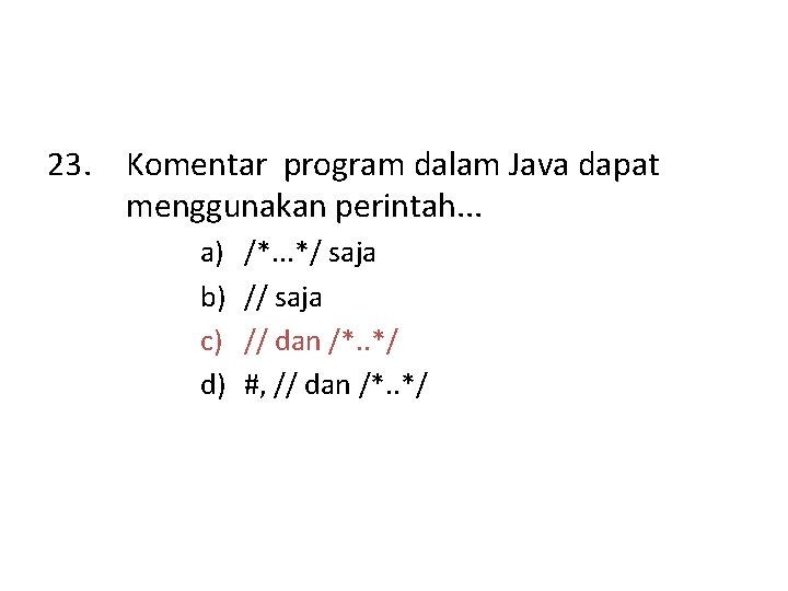 23. Komentar program dalam Java dapat menggunakan perintah. . . a) b) c) d) /*. . . */ saja // dan /*. . */ #, // dan /*. . */