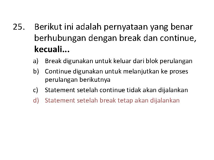 25. Berikut ini adalah pernyataan yang benar berhubungan dengan break dan continue, kecuali. . . a) Break digunakan untuk keluar dari blok perulangan b) Continue digunakan untuk melanjutkan ke proses perulangan berikutnya c) Statement setelah continue tidak akan dijalankan d) Statement setelah break tetap akan dijalankan