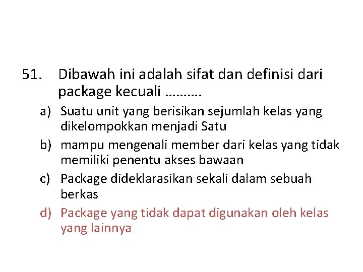 51. Dibawah ini adalah sifat dan definisi dari package kecuali ………. a) Suatu unit yang berisikan sejumlah kelas yang dikelompokkan menjadi Satu b) mampu mengenali member dari kelas yang tidak memiliki penentu akses bawaan c) Package dideklarasikan sekali dalam sebuah berkas d) Package yang tidak dapat digunakan oleh kelas yang lainnya