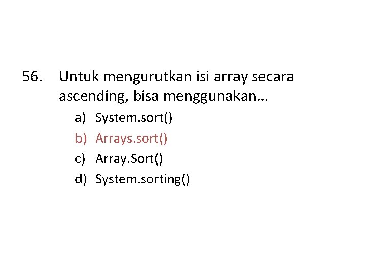 56. Untuk mengurutkan isi array secara ascending, bisa menggunakan… a) b) c) d) System. sort() Arrays. sort() Array. Sort() System. sorting()