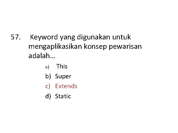 57. Keyword yang digunakan untuk mengaplikasikan konsep pewarisan adalah… a) This b) Super c) Extends d) Static