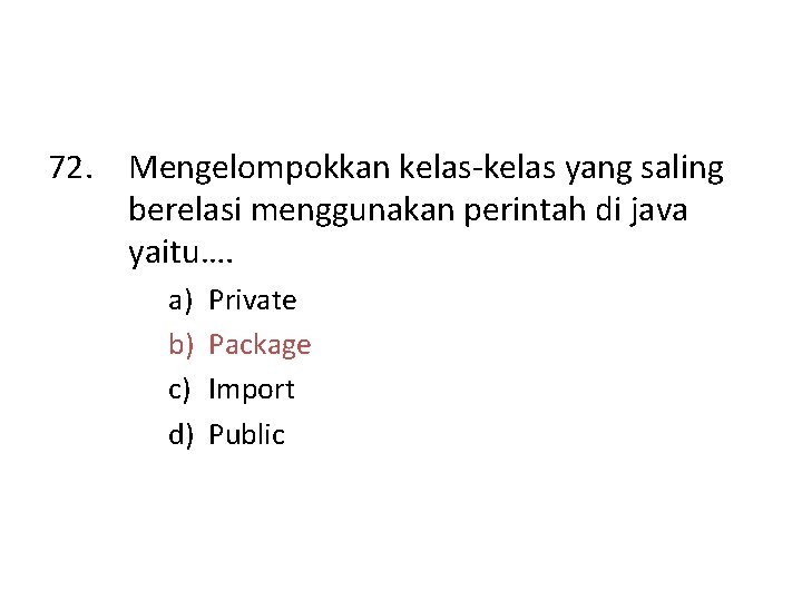 72. Mengelompokkan kelas-kelas yang saling berelasi menggunakan perintah di java yaitu…. a) b) c) d) Private Package Import Public