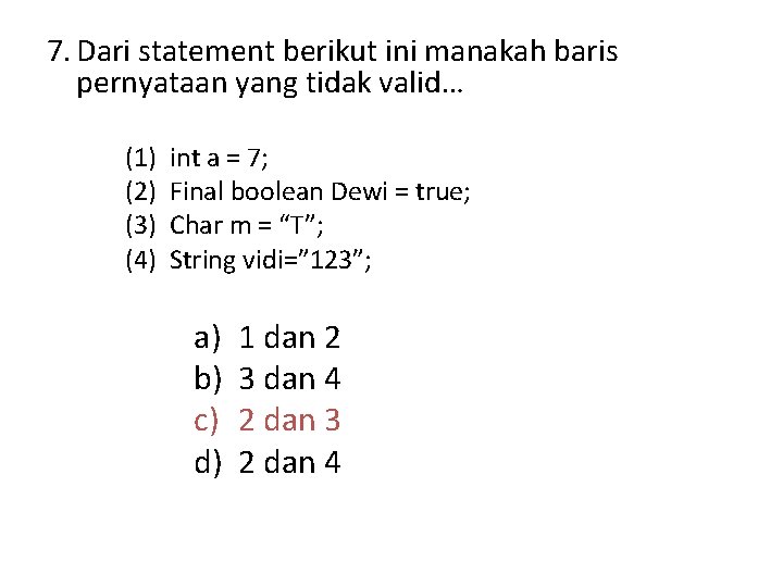 7. Dari statement berikut ini manakah baris pernyataan yang tidak valid… (1) int a = 7; (2) Final boolean Dewi = true; (3) Char m = “T”; (4) String vidi=” 123”; a) b) c) d) 1 dan 2 3 dan 4 2 dan 3 2 dan 4