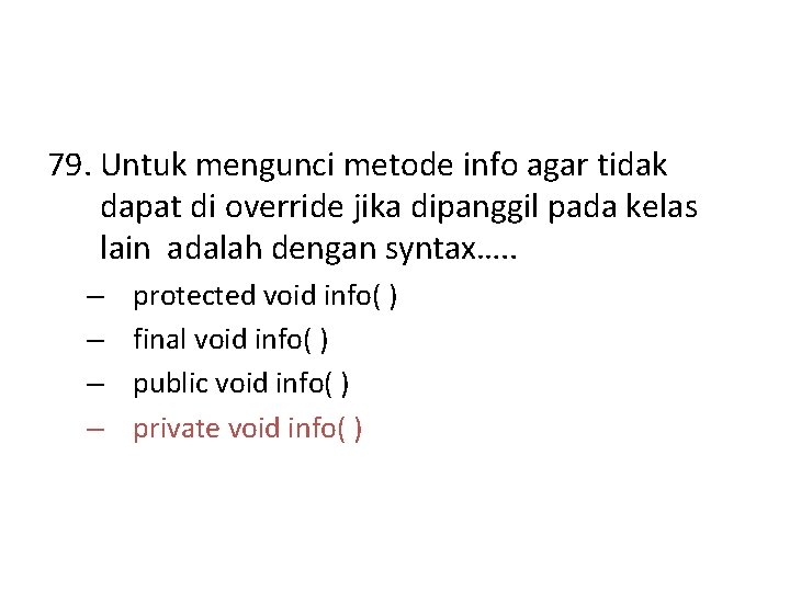 79. Untuk mengunci metode info agar tidak dapat di override jika dipanggil pada kelas lain adalah dengan syntax…. . – – protected void info( ) final void info( ) public void info( ) private void info( )