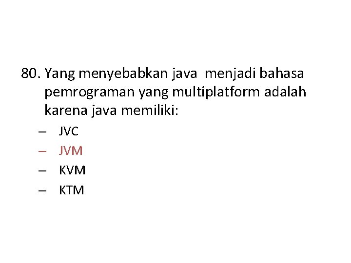 80. Yang menyebabkan java menjadi bahasa pemrograman yang multiplatform adalah karena java memiliki: – – JVC JVM KTM