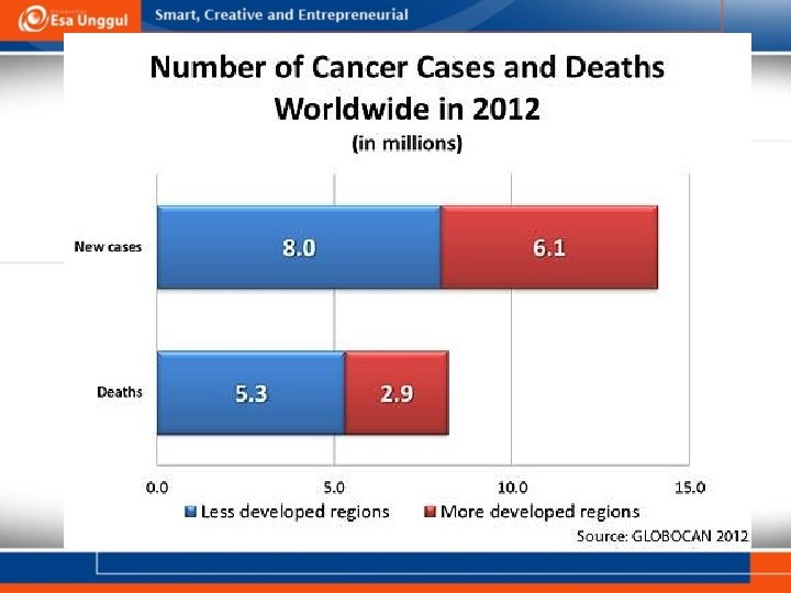Pendahuluan • Kanker adalah pembelahan dan pertumbuhan sel secara abnornal yang tidak dapat dikontrol sehingga cepat menyebar. • Kanker Multiplikasi sel (pertumbuhan/regenerasi) & Menyebar • Kanker Masalah kesehatan di dunia dan Indonesia