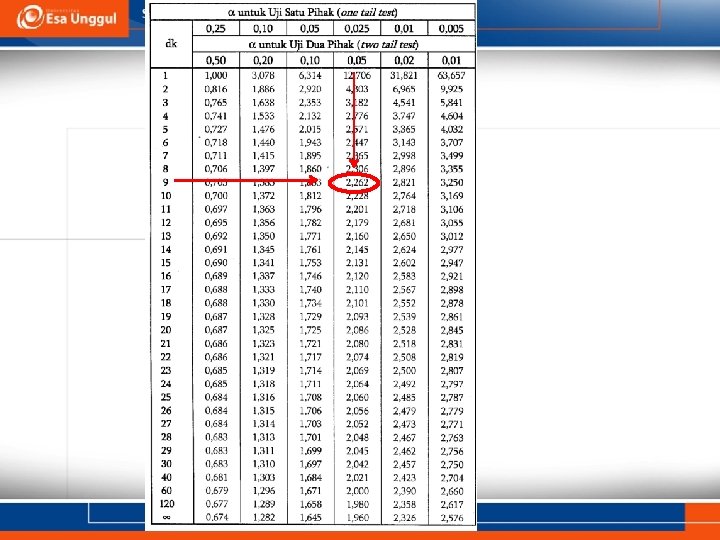 Dari perhitungan diperoleh: thitung = |-0, 432|= 0, 432 ttabel = |-2, 262|= 2, 262 (Lihat pada tabel di slide berikutnya)