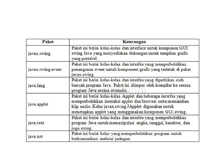 • AWT adalah sekumpulan library yang tidak tergantung platform (platform independent) dan digunakan untuk menyederhanakan implementasi user-interface • SWING adalah bentuk implementasi selanjutnya yang menambahkan komponen dalam sistem GUI tapi masih didasarkan pada arsitektur AWT (misalnya : untuk pembuatan event handling)