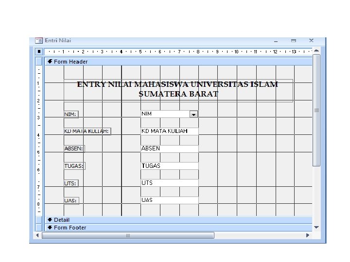 Pembuatan Form Entry Data Transkip Langkah – Langkah Pembuatan Form Entry Data Transkip • Klik form pada windows Database. Mahasiswa, kemudian pilih form wizard, sumber datanya di ambil dari Query transkrip. • Susun field-fieldnya sehingga tampak tampil pada gambar di bawah ini: