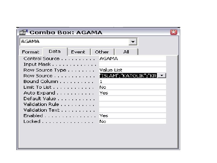 • Field Agama Di isi dengan menggunakan Lookup, Caranya : Klik kanan pada field Agama, cari Change to, Combo Box, Kemudian klik kanan lagi cari Properties, di lembar Data, cari “Control source = Agama, Row Source Type = Value List, Row Source = "ISLAM"; "KATOLIK"; "KRISTEN"; "HINDU"; "BUD HA” klik close untuk keluar dari kotak dialog Properties.