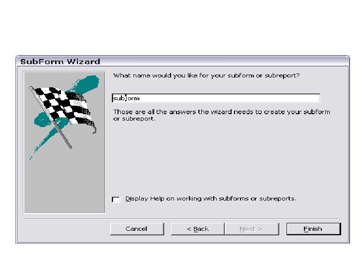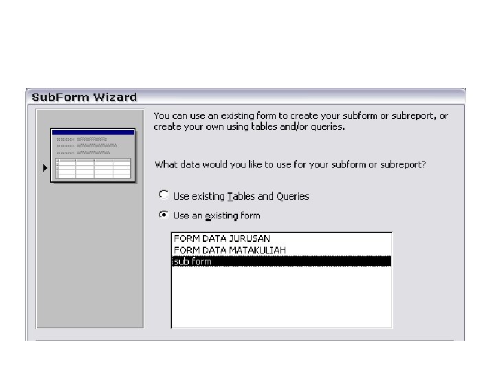 • Pada Option dipilih Use an existing form, maka akan muncul beberapa form yang pernah kita buat. Kemudian pilih nama form yang akan kita masukan kedalam form utama. Kemudian klik tombol Next untuk menjakankan perintah selanjutnya. • Kita diminta untuk memberikan namenya pada sub form, Klik tombol finish