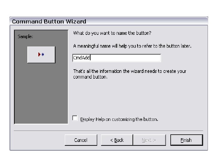 • Sekarang kita diminta untuk membuat Name pada tombol yang akan dibuat, cara pembuatan name ini tidak boleh menggunakan spasi. Karena kita akan membuat tombol add maka namenya kita ketikan dengan nama Cmd. Add. Kemudian klik Finish