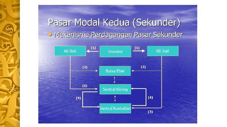 Pasar Sekunder • Harga terbentuk oleh investor melalui perantara efek (Anggota Bursa=AB) yang berdagang di bursa efek. • Transaksi dibebani biaya jual dan beli • Anggota Bursa memasukkan tawaran jual/beli investor ke dalam komputer perdagangan yang disediakan pihak bursa • Anggota Bursa Beli menyelesaikan pembayaran dana kepada Sentral Kliring, kemudian menerima sahamnya dengan cara pemindahbukuan oleh Sentral Kustodian dengan menunjukkan bukti pembayaran dari Sentral Kliring • Anggota Bursa Jual menyelesaikan penyerahan saham kepada Sentral Kustodian kemudian menerima dana dengan cara pemindahbukuan oleh Sentral Kliring dengan menunjukkan bukti penyerahan efek dari Sentral Kustodian
