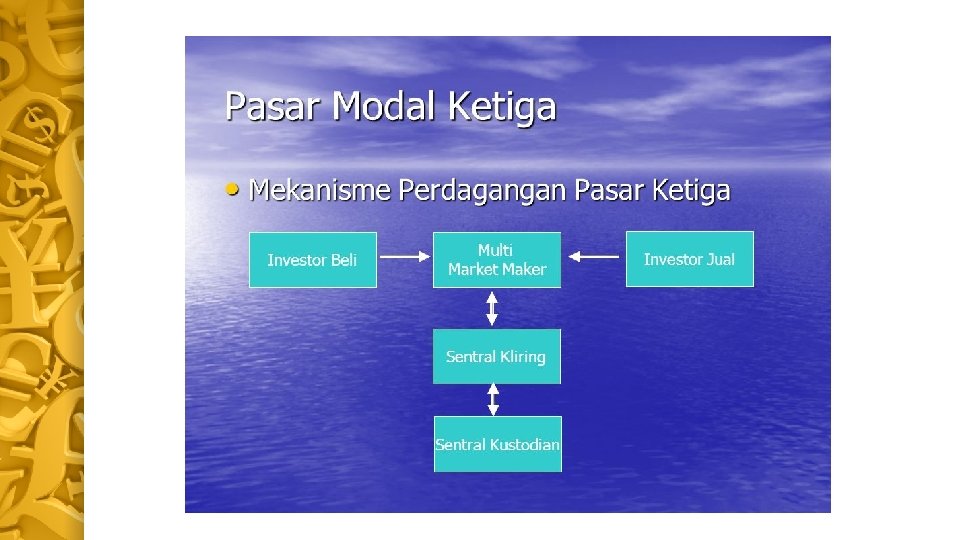Pasar Ketiga (Over The Counter Market) • Harga dibentuk oleh market maker • Investor membeli dan menjual dari dan ke market maker • Investor dapat memilih market maker yang memberi harga terbaik • Perdagangan dilakukan di kota-kota besar dalam satu jaringan nasional • Market maker berdagang dari kantor masing-masing melalui jaringan komputer • Mesin utama ada di OTC Market Pusat yang terhubung dengan mesin di kantor market maker di kota-kota lain • Mesin OTC terintegrasi dengan mesin di Sentral Kliring dan Sentral Kustodian. • Market maker menyelesaikan pembayaran dengan Sentral Kliring dan menyelesaikan penyimpanan efek dengan Sentral Kustodian.