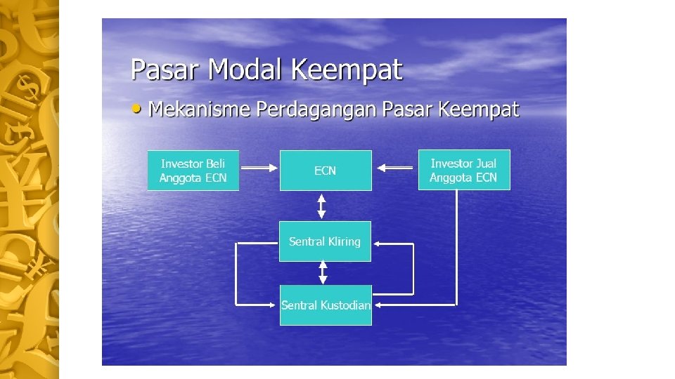 Pasar Keempat • Investor Beli dan investor jual bertransaksi langsung melalui ECN (Electronic Communication Network) • Harga terbentuk dalam tawar menawar langsung antar investor beli dan investor jual • Investor menjadi anggota ECN, Sentral Kliring, Sentral Kustodian • ECN, Sentral Kliring, dan Sentral Kustodian terjalin dalam satu sistem jaringan perdagangan