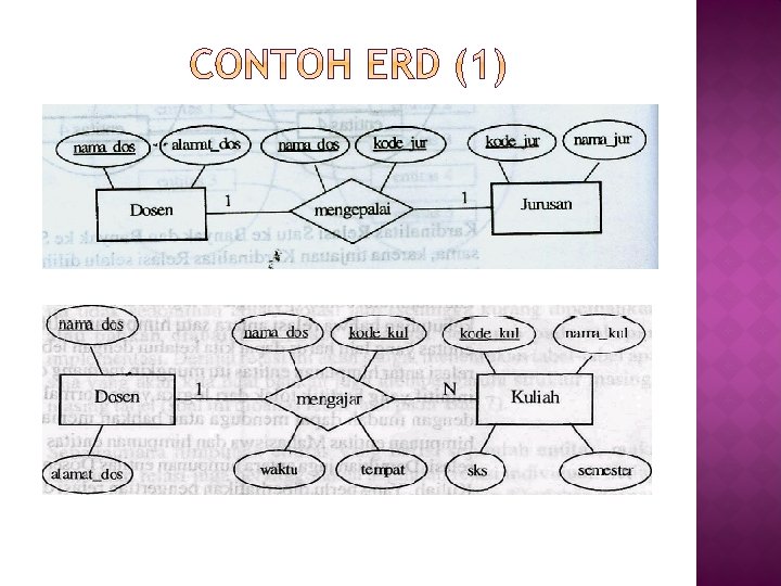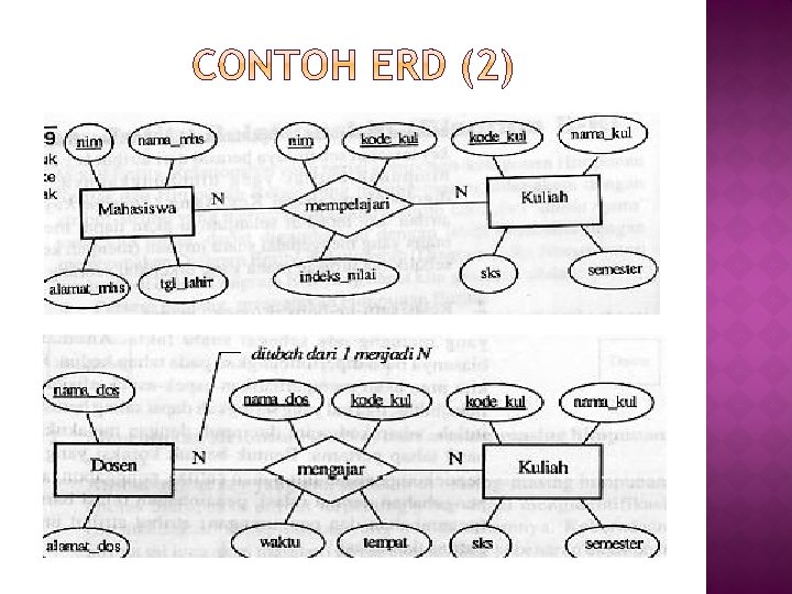 � Mengidentifikasi dan menetapkan seluruh himpunan entitas yang akan terlibat � Menentukan atribut-atribut key dari masing himpunan entitas � Mengidentifikasi dan menetapkan seluruh himpunan relasi di antara himpunan entitas yang ada beserta foreign key-nya. � Menentukan derajat/kardinalitas relasi untuk setiap himpunan relasi. � Melengkapi himpunan entitas dan himpunan relasi dengan atribut-atribut deskriptif (non key).