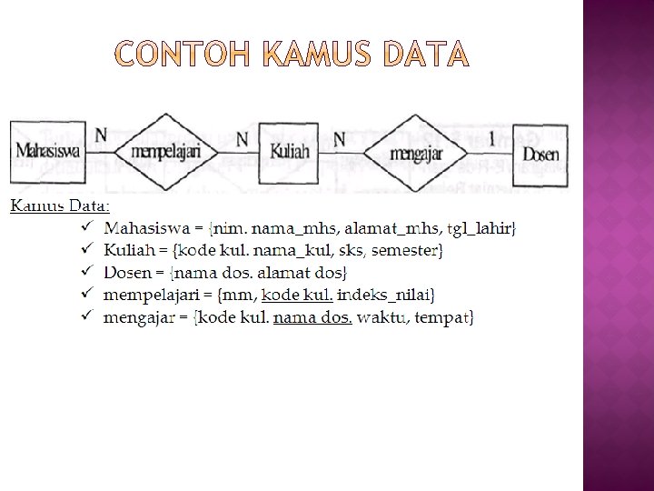 � Pada sebuah sistem yang ruang lingkupnya lebar dan kompleks, penggambaran atribut dalam sebuah Diagram E-R seringkali malah mengganggu objektif yang ingin dicapai tersebut. � Kita dapat memisahkan pendeklarasian atribut-atribut ini dari Diagram E-R dan menyatakannya dalam sebuah kamus data. � Kamus data berisi daftar atribut yang diapit kurung kurawal ('{' dan '}'). Atribut yang berfungsi sebagai key juga dibedakan dengan yang bukan key dengan menggarisbawahi atribut tersebut.