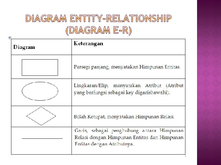 Model Entity-Relationship semesta data yang ada diterjemahkan atau ditransformasikan dengan memanfaatkan sejumlah perangkat konseptual menjadi sebuah diagram data, yang umum disebut sebagai Diagram Entity. Relationship (Diagram E-R). Komponen utama pembentuk Model Entity. Relationship, yaitu: Entitas (Entity) Relasi (Relation)