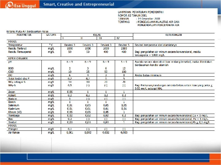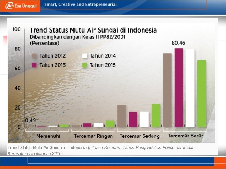 Tingkat Pencemaran Air: n n n Diketahui dari pengujian yang dilakukan terhadap sifat kimia-fisika air Sifat fisik: warna, bau , rasa, kekeruhan, daya hantar listrik Sifat kimia : Nilai p. H, suhu, Oksigen terlarut, BOD, COD, NO 3, Amoniak, Fosfat, Klorida