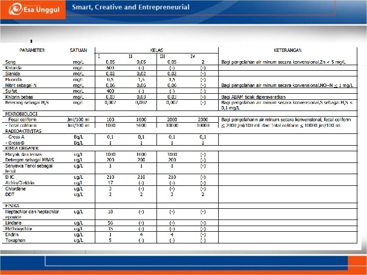 Air yang tidak tercemar n n Tidak selalu merupakan air murni Merupakan air yang mengandung bahan asing tertentu dalam jumlah yang dapat di toleransi sehingga air tsb dapat dipergunakan sesuai dengan peruntukannya.