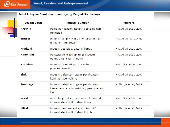 Logam berat n Logam berat merupakan parameter yang banyak ditemui di dalam air limbah industri. Logam berat yang umum ditemui di dalam air limbah antara lain arsenik, timbal, merkuri, kadmium, kromium, zink, tembaga, perak, dan nikel