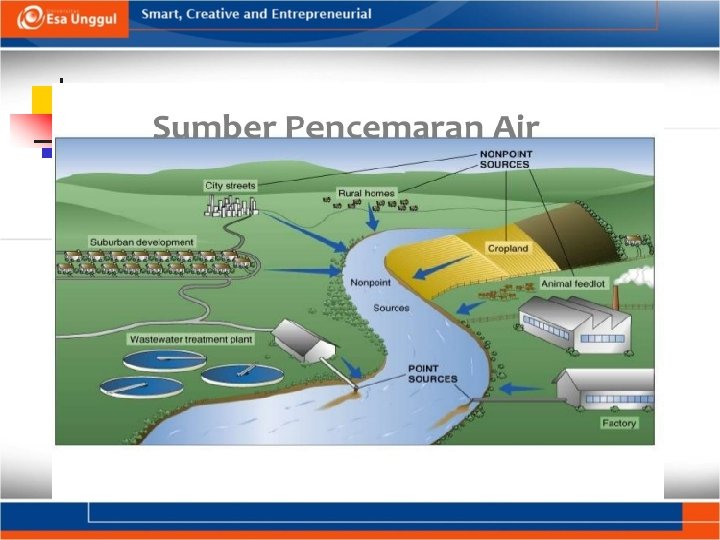 Sumber Pencemaran sumber titik berasal dari • Bisnis komersial dan industri • menggunakan bahan-bahan berbahaya dalam pembuatan atau pemeliharaan, dan kemudian berbagai membuang limbah dari operasi mereka. Bahan baku dan limbah dapat mencakup polutan seperti pelarut, produk minyak bumi (seperti minyak dan bensin), atau logam berat. • Pertanian • Kotoran hewan, tumbuh-tumbuhan dan hewan yang mati, bahan pencemar organik yang tidak dapat diuraikan oleh mikroorganisme yaitu senyawa organik berasal dari pestisida, herbisida, polimer seperti plastik, deterjen, serat sintetis, limbah industri dan limbah minyak. • Kota • pabrik pengolahan air limbah, tempat pembuangan sampah, stasiun utilitas, kolam motor, dan fasilitas pemeliharaan armada.