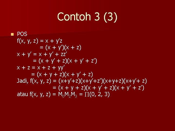 Contoh 3 (2) n SOP x = x(y + y’) = xy + xy’ = xy (z + z’) + xy’(z + z’) = xyz + xyz’ + xy’z’ y’z = y’z (x + x’) = xy’z + x’y’z Jadi f(x, y, z) = x + y’z = xyz + xyz’ + xy’z’ + xy’z + x’y’z = x’y’z + xy’z’ + xy’z + xyz’ + xyz atau f(x, y, z) = m 1 + m 4 + m 5 + m 6 + m 7 = (1, 4, 5, 6, 7)