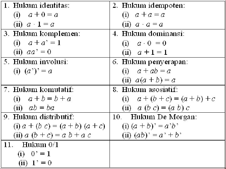 Penyederhanaan Secara Aljabar n Menggunakan sifat-sifat/hukum-hukum aljabar boolean, seperti di logika matematika.