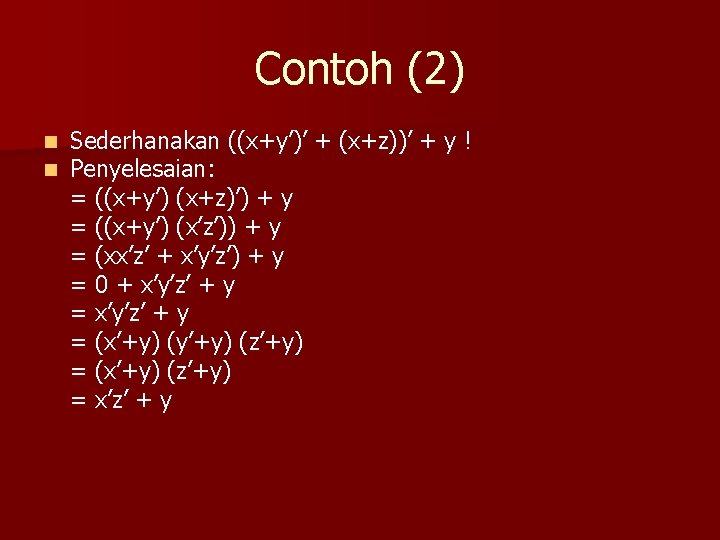 Contoh (1) Sederhanakan a + a’b ! n Penyelesaian: a + a’b = (a + ab) + a’b = a + (ab + a’b) = a + (a + a’) b =a+1 b =a+b n (Penyerapan) (Asosiatif) (Distributif) (Komplemen) (Identitas)