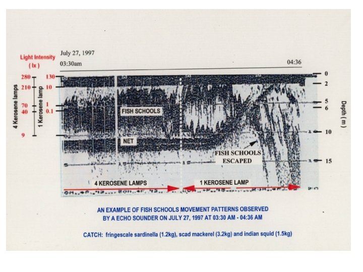 HORIZONTAL DISTANCE (m) -7 0 0 7 260. 0 88. 0 135. 0 -5 135. 0 105. 0 20. 0 24. 0 14. 0 32. 0 DEPTH (m) 9. 0 18. 8 20. 0 7. 0 -15 11. 5 8. 0 11. 5 14. 0 5. 0 9. 0 6. 0 9. 0 3. 0 6. 5 3. 5 6. 5 -20 2. 0 4. 0 3. 0 1. 8 0. 8 -25 2. 1 0. 1 1. 5 5. 0 2. 0 Unit : lux 0. 1 A 3. 5 4. 5 2. 5 0. 1 1. 0 1. 5 0. 0 0. 1 0. 5 0. 0 0. 0 -30 2. 5 2. 8 1. 0 -30 3. 0 6. 0 1. 5 0. 5 5. 0 3. 5 1. 9 0. 5 7. 5 9. 0 3. 0 -25 10. 4 10. 5 12. 0 1. 0 0. 5 17. 5 5. 0 2. 1 16. 5 16. 0 7. 5 1. 2 2. 5 22. 0 16. 0 7. 5 -20 19. 5 24. 0 10. 5 -15 26. 0 45. 0 10. 4 3. 0 3. 7 65. 0 16. 5 2. 5 4. 5 1. 5 -10 12. 0 50. 0 60. 0 24. 0 32. 0 75. 0 86. 0 95. 0 26. 0 14 115. 0 60. 0 19. 5 16. 0 7 140. 0 45. 0 55. 0 -10 -5 80. 0 55. 0 115. 0 50. 0 85. 0 0 86. 0 105. 0 80. 0 -7 75. 0 105. 0 31. 5 -14 0 108. 0 135. 0 55. 0 HORIZONTAL DISTANCE (m) 14 DEPTH (m) -14 0. 0 Unit : lux 0. 0 B THE UNDERWATER LIGHT INTENSITY DISTRIBUTION PATTERN OF BOAT BAGAN A : BAGAN WITH ALUMINIUM LAMP SHADE B : BAGAN WITH PLASTIC LAMP SHADE