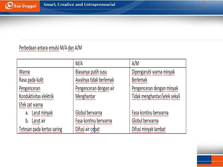 • Koalesen: butir-butir cairan yang bergabung dan membentuk dua lapisan yang terpisah. • Zat pengemulsi (emulgator, surfaktan) merupakan zat yang penting dalam menstabilkan emulsi. • Tipe Emulsi ada 4 : emulsi M/A, A/M, M/A/M dan A/M/A. • M/A artinya fase intern (dispers) atau diskontinu adalah minyak (M) sedangkam fase extern atau kontinunya adalah air (A). • Zat pengemulsi adalah : PGA, tragacantha, gelatin, sapo, senyawa ammonium kwartener, Cholesterol, surfaktan seperti Tween dan span. • Emulsa dapat dibedakan dalam Emulsa Vera (alam) dan Emulsa Spuria (buatan)