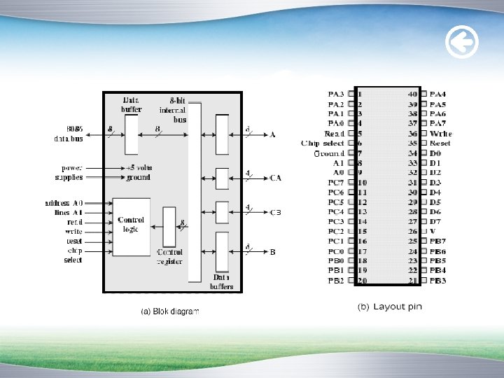 Modul I/O PPI 8255 Bagian kanan dari blok diagram Intel 8255 A v 24 saluran antarmuka luar 8 bit port A 8 bit port B 4 bit port CA dan 4 bit port CB v Saluran tersebut dapat diprogram dari mikroprosesor 8086 dengan menggunakan register kontrol untuk menentukan bermacam–macam mode operasi dan konfigurasinya.