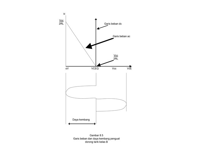 Karakteristik Kerja Penguat Dorong Tarik Kelas B • Garis beban dc penguat kelas B dorong – tarik adalah vertical (Gambar 8. 5) pada Vc. E = Vcc/2, karena tegangan antara kolektor dan emitter adalah tetap untuk arus kolektor sembarang. Garis beban ac mempunyai lereng -1 / RL dan memotong garis beban dc dititik Vc. E = Vcc/2 RL = VCEQ pada ic = 0. Titik potongnya dengan sumbu ic adalah pada ic=Vcc/2 RL. Daya kembang (complience) juga terlihat pada gambar 8, 5 yang mana setiap transistor dapat melakukan transisi penuh dari titik lengang VCEQ hingga mendekati 0 volt.