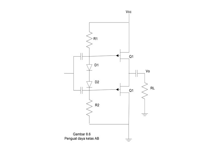 Karena kedua diode tersebut menghantarkan arus, maka penurunan tegangan pada kedua diode adalah = 2 x VF = 2 x 0, 7 V = 1, 4 Volt dengan VF : tegangan maju diode (untuk diode Silikon VF = 0, 7 Volt). Penurunan tegangan antara basisi transistor Q 1 dan Q 2 adalah sama dengan penurunan tegangan pada kedua diode D 1 dan D 2 : VBE 1 + VEB 2 = 1, 4 Volt Bila kedua transistor sepadan maka: VBE 1 + = - VBE 2 = 0, 7 Volt Sehingga kedua transistor menghantar meskipun sinyal masukan 0 Volt.